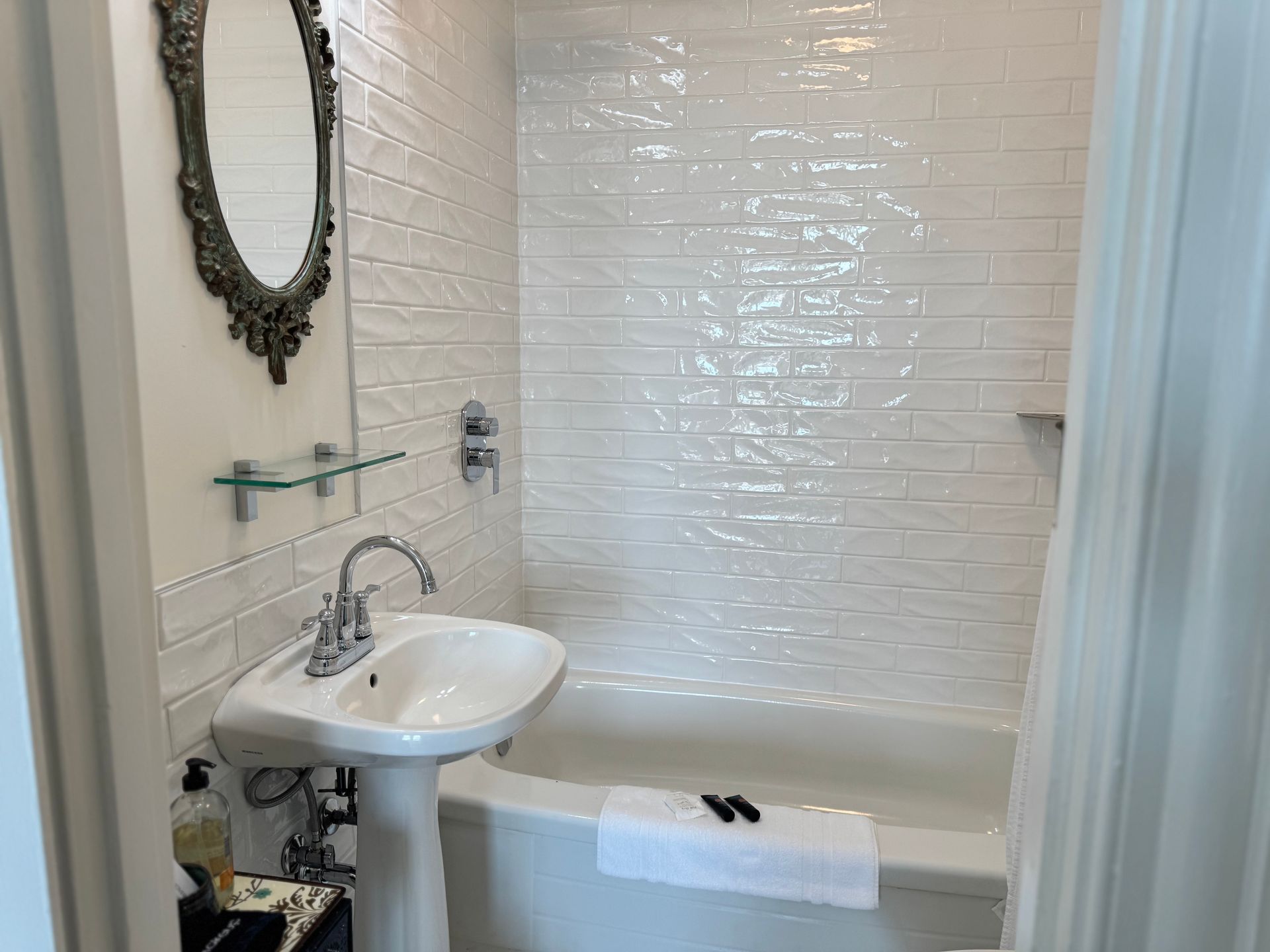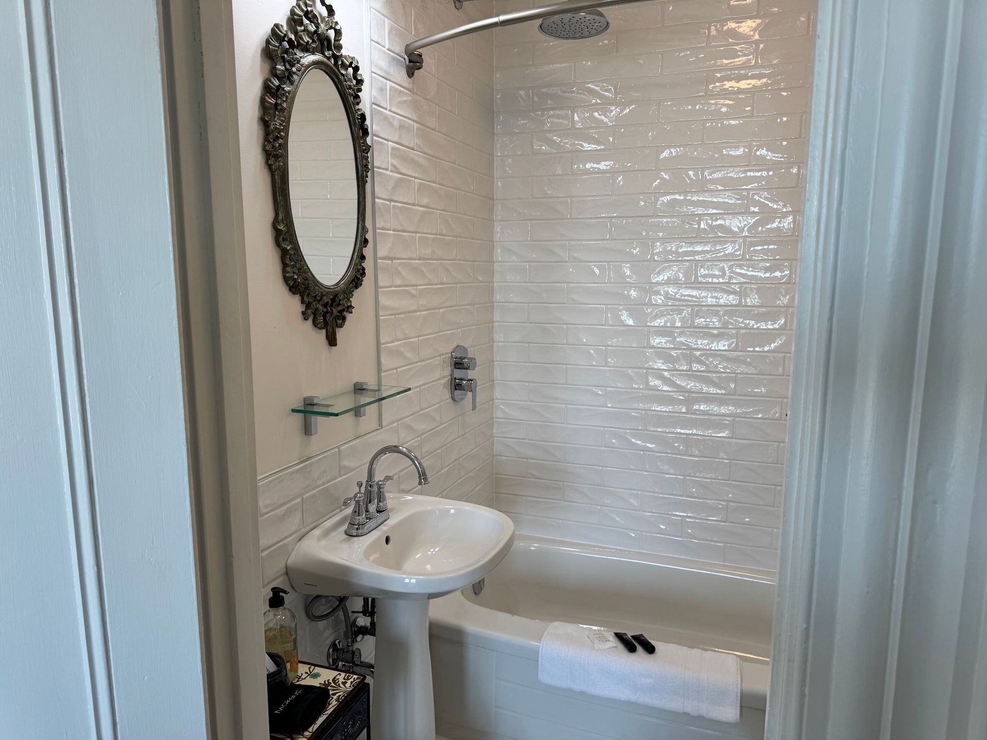 The Mayflower Room captures the essence of warm and inviting English country style, situated on the second floor and boasting magnificent 10-foot ceilings. Delight in the morning sun as you gaze out at the front gardens through the spacious, bright windows. The queen bed is elegantly adorned with luxurious COMPHY LINENS, designed to provide a truly restful night's sleep.